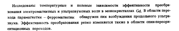 Исследованы температурные и полевые зависимости эффективности преобразования электромагнитных и ультразвуковых волн в монокристаллах Gd. В области перехода парамагнетик ферромагнетик обнаружен пик возбуждения продольного ультразвука. Эффективность преобразования резко изменяется также в области спин-переори-ентационных переходов.