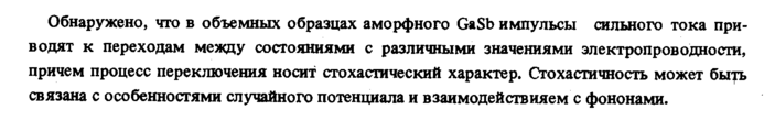 Обнаружено, что в объемных образцах аморфного GaSb импульсы сильного тока приводят к переходам между состояниями с различными значениями электропроводности, причем процесс переключения носит стохастический характер. Стохастичность может быть связана с особенностями случайного потенциала и взаимодействияем с фононами.