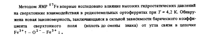 Методом ЯМР 5 7Fe впервые исследовано влияние высоких гидростатических давлений на сверхтонкие взаимодействия в редкоземельных ортоферритах при Τ = 4,2 К. Обнаружена новая закономерность, заключающаяся в сильной зависимости барического коэффициента сверхтонкого поля (вплоть до смены знака) от угла связи в цепочке Fe3+t -02"-Fe3+ \.
