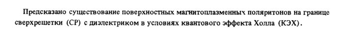 Предсказано существование поверхностных магнитоплазменных поляритонов на границе сверхрешетки (CP) с диэлектриком в условиях квантового эффекта Холла (КЭХ).