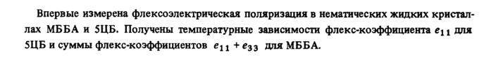 Впервые измерена флексоэлектрическая поляризация в нематических жидких кристаллах МБ Б А и 5 ЦБ. Получены температурные зависимости флекс-коэффициента ец для 5ЦБ и суммы флекс-коэффициентов ец + е33 для МББА.
