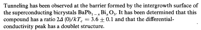 Tunneling has been observed at the barrier formed by the intergrowth surface of the superconducting bicrystals BaP^ _xBix03. It has been determined that this compound has a ratio 2Δ [Q)/kTc = 3.6 + 0.1 and that the differential-conductivity peak has a doublet structure.