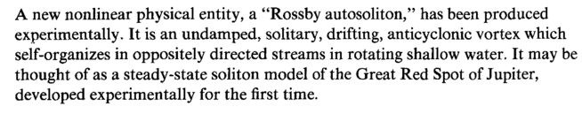 A new nonlinear physical entity, a "Rossby autosoliton," has been produced experimentally. It is an undamped, solitary, drifting, anticyclonic vortex which self-organizes in oppositely directed streams in rotating shallow water. It may be thought of as a steady-state soliton model of the Great Red Spot of Jupiter, developed experimentally for the first time.