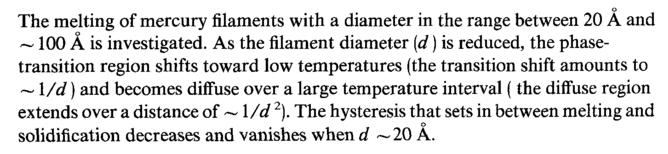 о The melting of mercury filaments with a diameter in the range between 20 A and — 100 A is investigated. As the filament diameter (d) is reduced, the phase-transition region shifts toward low temperatures (the transition shift amounts to ~ l/d) and becomes diffuse over a large temperature interval (the diffuse region extends over a distance of ~ l/d 2). The hysteresis that sets in between melting and о solidification decreases and vanishes when d —20 A.