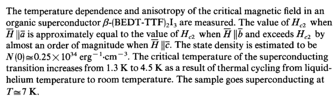 The temperature dependence and anisotropy of the critical magnetic field in an organic superconductor /?-(BEDT-TTF)2I3 are measured. The value of Hc2 when H\\a is approximately equal to the value ofHc2 when Η \\b and exceeds Hc2 by almost an order of magnitude when Η ||c. The state density is estimated to be #(0)^0.25 Χ1034 erg-1-cm-3. The critical temperature of the superconducting transition increases from 1.3 К to 4.5 К as a result of thermal cycling from liquid-helium temperature to room temperature. The sample goes superconducting at 7^7 K.