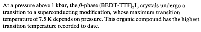 At a pressure above 1 kbar, the /?-phase (BEDT-TTF)2I3 crystals undergo a transition to a superconducting modification, whose maximum transition temperature of 7.5 К depends on pressure. This organic compound has the highest transition temperature recorded to date.