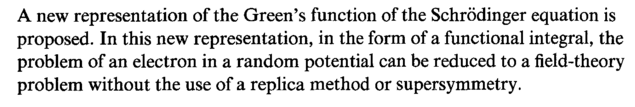 A new representation of the Green's function of the Schrodinger equation is proposed. In this new representation, in the form of a functional integral, the problem of an electron in a random potential can be reduced to a field-theory problem without the use of a replica method or supersymmetry.