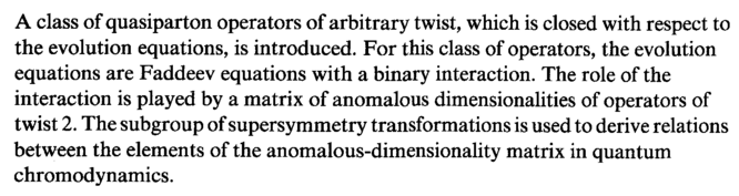 A class of quasiparton operators of arbitrary twist, which is closed with respect to the evolution equations, is introduced. For this class of operators, the evolution equations are Faddeev equations with a binary interaction. The role of the interaction is played by a matrix of anomalous dimensionalities of operators of twist 2. The subgroup of supersymmetry transformations is used to derive relations between the elements of the anomalous-dimensionality matrix in quantum chromodynamics.