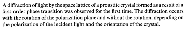 A diffraction of light by the space lattice of a proustite crystal formed as a result of a first-order phase transition was observed for the first time. The diffraction occurs with the rotation of the polarization plane and without the rotation, depending on the polarization of the incident light and the orientation of the crystal.