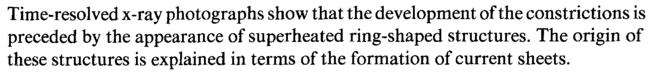 Time-resolved x-ray photographs show that the development of the constrictions is preceded by the appearance of superheated ring-shaped structures. The origin of these structures is explained in terms of the formation of current sheets.