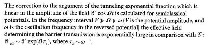 The correction to the argument of the tunneling exponential function which is linear in the amplitude of the field W cos Ωί is calculated for semiclassical potentials. In the frequency interval F> Ω > ω (Fis the potential amplitude, and ω is the oscillation frequency in the reversed potential) the effective field determining the barrier transmission is exponentially large in comparison with W: ^eff ~ % exP(^rs )> where rs ~