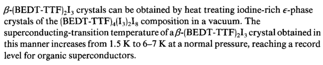 /?-(BEDT-TTF)2I3 crystals can be obtained by heat treating iodine-rich e-phase crystals of the (BEDT~TTF)4(I3)2I8 composition in a vacuum. The superconducting-transition temperature of a/?-(BEDT-TTF)2I3 crystal obtained in this manner increases from 1.5 К to 6-7 К at a normal pressure, reaching a record level for organic superconductors.