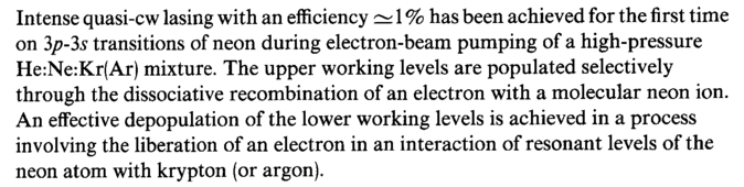 Intense quasi-cw lasing with an efficiency ^ 1 % has been achieved for the first time on 3/?-3s transitions of neon during electron-beam pumping of a high-pressure He:Ne:Kr(Ar) mixture. The upper working levels are populated selectively through the dissociative recombination of an electron with a molecular neon ion. An effective depopulation of the lower working levels is achieved in a process involving the liberation of an electron in an interaction of resonant levels of the neon atom with krypton (or argon).