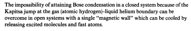 The impossibility of attaining Bose condensation in a closed system because of the Kapitsa jump at the gas (atomic hydrogen)-liquid helium boundary can be overcome in open systems with a single "magnetic wall" which can be cooled by releasing excited molecules and fast atoms.