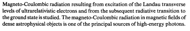 Magneto-Coulombic radiation resulting from excitation of the Landau transverse levels of ultrarelativistic electrons and from the subsequent radiative transition to the ground state is studied. The magneto-Coulombic radiation in magnetic fields of dense astrophysical objects is one of the principal sources of high-energy photons.