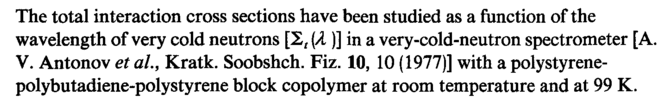 The total interaction cross sections have been studied as a function of the wavelength of very cold neutrons [Σ, (λ )] in a very-cold-neutron spectrometer [A. V. Antonov et al., Kratk. Soobshch. Fiz. 10, 10 (1977)] with a polystyrene-polybutadiene-polystyrene block copolymer at room temperature and at 99 K.
