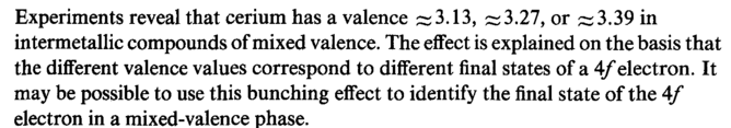 Experiments reveal that cerium has a valence ~3.13, —3,27, or —3.39 in intermetallic compounds of mixed valence. The effect is explained on the basis that the different valence values correspond to different final states of a 4f electron. It may be possible to use this bunching effect to identify the final state of the 4/ electron in a mixed-valence phase.