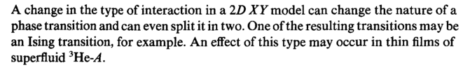 A change in the type of interaction in a 2D XY model can change the nature of a phase transition and can even split it in two. One of the resulting transitions may be an Ising transition, for example. An effect of this type may occur in thin films of superfluid 3Не-Л.