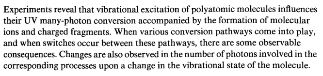 Experiments reveal that vibrational excitation of polyatomic molecules influences their UV many-photon conversion accompanied by the formation of molecular ions and charged fragments. When various conversion pathways come into play, and when switches occur between these pathways, there are some observable consequences. Changes are also observed in the number of photons involved in the corresponding processes upon a change in the vibrational state of the molecule.