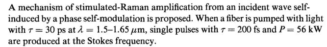A mechanism of stimulated-Raman amplification from an incident wave self-induced by a phase self-modulation is proposed. When a fiber is pumped with light with r — 30 ps at λ — 1.5-1.65 μτη, single pulses with r = 200 fs and Ρ = 56 kW are produced at the Stokes frequency.