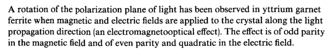 A rotation of the polarization plane of light has been observed in yttrium garnet ferrite when magnetic and electric fields are applied to the crystal along the light propagation direction (an electromagnetooptical effect). The effect is of odd parity in the magnetic field and of even parity and quadratic in the electric field.