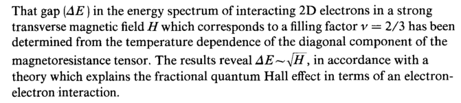 That gap (ΔΕ) in the energy spectrum of interacting 2D electrons in a strong transverse magnetic field Η which corresponds to a filling factor ν — 2/3 has been determined from the temperature dependence of the diagonal component of the magnetoresistance tensor. The results reveal ΔΕ~4Η, in accordance with a theory which explains the fractional quantum Hall effect in terms of an electron-electron interaction.