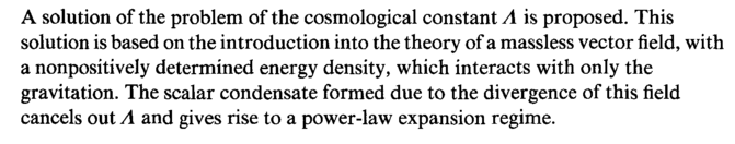 A solution of the problem of the cosmological constant Λ is proposed. This solution is based on the introduction into the theory of a massless vector field, with a nonpositively determined energy density, which interacts with only the gravitation. The scalar condensate formed due to the divergence of this field cancels out Λ and gives rise to a power-law expansion regime.