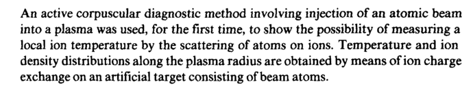 An active corpuscular diagnostic method involving injection of an atomic beam into a plasma was used, for the first time, to show the possibility of measuring a local ion temperature by the scattering of atoms on ions. Temperature and ion density distributions along the plasma radius are obtained by means of ion charge exchange on an artificial target consisting of beam atoms.