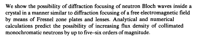 We show the possibility of diffraction focusing of neutron Bloch waves inside a crystal in a manner similar to diffraction focusing of a free electromagnetic field by means of Fresnel zone plates and lenses. Analytical and numerical calculations predict the possibility of increasing flux density of collimated monochromatic neutrons by up to five-six orders of magnitude.
