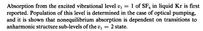 Absorption from the excited vibrational level v3 = 1 of SF6 in liquid Kr is first reported. Population of this level is determined in the case of optical pumping, and it is shown that nonequilibrium absorption is dependent on transitions to anharmonic structure sub-levels of the u3 = 2 state.