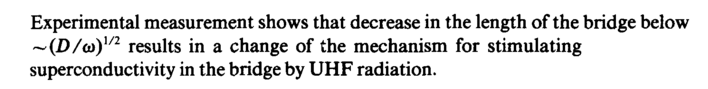 Experimental measurement shows that decrease in the length of the bridge below ~(D/ti>)1/2 results in a change of the mechanism for stimulating superconductivity in the bridge by UHF radiation.
