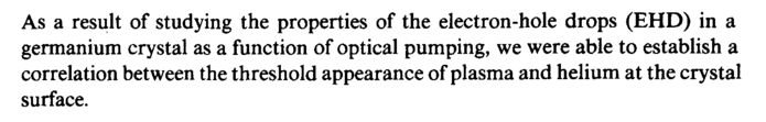 As a result of studying the properties of the electron-hole drops (EHD) in a germanium crystal as a function of optical pumping, we were able to establish a correlation between the threshold appearance of plasma and helium at the crystal surface.
