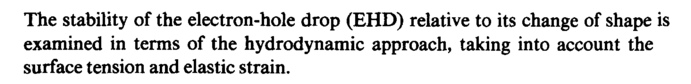 The stability of the electron-hole drop (EHD) relative to its change of shape is examined in terms of the hydrodynamic approach, taking into account the surface tension and elastic strain.