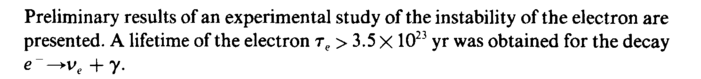 Preliminary results of an experimental study of the instability of the electron are presented. A lifetime of the electron тг > 3.5 χ ΙΟ23 yr was obtained for the decay e"->ve + y.