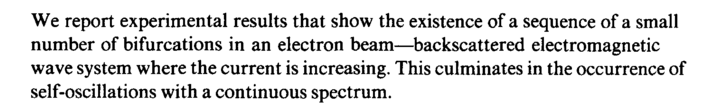 We report experimental results that show the existence of a sequence of a small number of bifurcations in an electron beam—backscattered electromagnetic wave system where the current is increasing. This culminates in the occurrence of self-oscillations with a continuous spectrum.