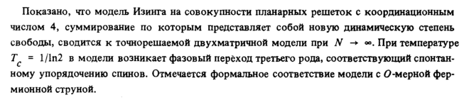 Показано, что модель Изинга на совокупности планарных решеток с координационным числом 4, суммирование по которым представляет собой новую динамическую степень свободы, сводится к точнорешаемой двухматричной модели при N -* <*>. При температуре Г, = 1/1п2 в модели возникает фазовый переход третьего рода, соответствующий спонтанному упорядочению спинов. Отмечается формальное соответствие модели с О-мерной фер-мионной струной.