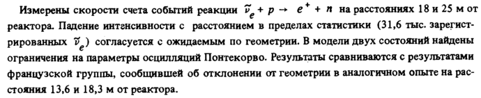 Измерены скорости счета событий реакции »е + ρ ~* е * + л на расстояниях 18 и 25 м от реактора. Падение интенсивности с расстоянием в пределах статистики (31,6 тыс. зарегистрированных vg) согласуется с ожидаемым по геометрии. В модели двух состояний найдены ограничения на параметры осцилляций Понтекорво. Результаты сравниваются с результатами французской группы, сообщившей об отклонении от геометрии в аналогичном опыте на расстояния 13,6 и 18,3 м от реактора.