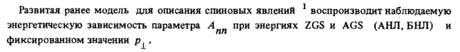 Развитая ранее модель для описания спиновых явлений воспроизводит наблюдаемую энергетическую зависимость параметра Апп при энергиях ZGS и AGS (АИЛ, БНЛ) и фиксированном значении ρ .