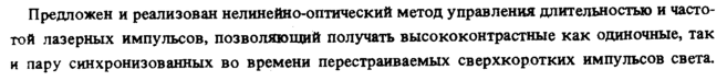 Предложен и реализован нелинейно-оптический метод управления длительностью и частотой лазерных импульсов, позволяющий получать высококонтрастные как одиночные, так и пару синхронизованных во времени перестраиваемых сверхкоротких импульсов света.