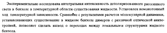Экспериментально исследована интегральная интенсивность деполяризованного рассеянного света в бензоле в температурной области существования жидкости. Установлен немонотонный ход температурной зависимости. Сравнение с результатами расчетов молекулярной динамики, устанавливающих существование в жидком бензоле димеров с различной оптической анизотропией, позволяет сделать вывод о переходах между локальными структурами жидкого бензола.