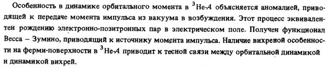Особенность в динамике орбитального момента в Не-А объясняется аномалией, приводящей к передаче момента импульса из вакуума в возбуждения. Этот процесс эквивалентен рождению электронно-позитронных пар в электрическом поле. Получен функционал Весса Зумино, приводящий к источнику момента импульса. Наличие вихревой особенности на ферми-поверхности в Не^4 приводит к тесной связи между орбитальной динамикой и динамикой вихрей.