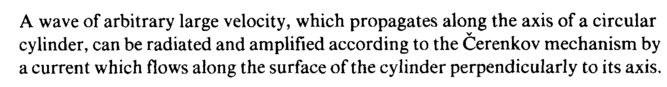 A wave of arbitrary large velocity, which propagates along the axis of a circular cylinder, can be radiated and amplified according to the Cerenkov mechanism by a current which flows along the surface of the cylinder perpendicularly to its axis.