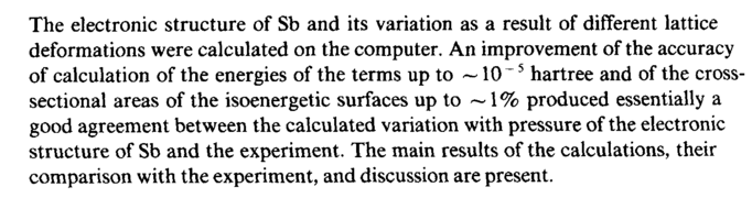 The electronic structure of Sb and its variation as a result of different lattice deformations were calculated on the computer. An improvement of the accuracy of calculation of the energies of the terms up to —10 ~5 hartree and of the cross-sectional areas of the isoenergetic surfaces up to ~ 1 % produced essentially a good agreement between the calculated variation with pressure of the electronic structure of Sb and the experiment. The main results of the calculations, their comparison with the experiment, and discussion are present.