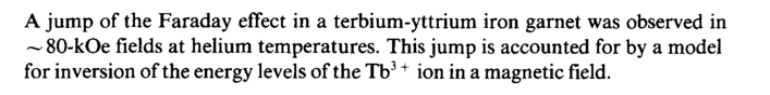 A jump of the Faraday effect in a terbium-yttrium iron garnet was observed in ~ 80-kOe fields at helium temperatures. This jump is accounted for by a model for inversion of the energy levels of the Tb3 + ion in a magnetic field.