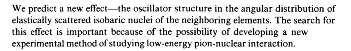 We predict a new effect—the oscillator structure in the angular distribution of elastically scattered isobaric nuclei of the neighboring elements. The search for this effect is important because of the possibility of developing a new experimental method of studying low-energy pion-nuclear interaction.