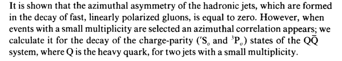 It is shown that the azimuthal asymmetry of the hadronic jets, which are formed in the decay of fast, linearly polarized gluons, is equal to zero. However, when events with a small multiplicity are selected an azimuthal correlation appears; we calculate it for the decay of the charge-parity ('S0 and 3P0) states of the QQ system, where Q is the heavy quark, for two jets with a small multiplicity.