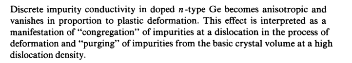 Discrete impurity conductivity in doped η-type Ge becomes anisotropic and vanishes in proportion to plastic deformation. This effect is interpreted as a manifestation of "congregation" of impurities at a dislocation in the process of deformation and "purging" of impurities from the basic crystal volume at a high dislocation density.