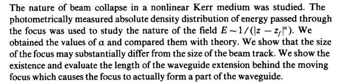 The nature of beam collapse in a nonlinear Kerr medium was studied. The photometrically measured absolute density distribution of energy passed through the focus was used to study the nature of the field Ε ~ 1 /(|z — zf\a). We obtained the values of α and compared them with theory. We show that the size of the focus may substantially differ from the size of the beam track. We show the existence and evaluate the length of the waveguide extension behind the moving focus which causes the focus to actually form a part of the waveguide.