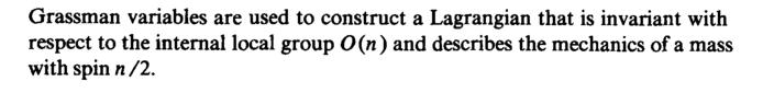 Grassman variables are used to construct a Lagrangian that is invariant with respect to the internal local group 0(n) and describes the mechanics of a mass with spin η /2.