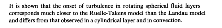It is shown that the onset of turbulence in rotating spherical fluid layers corresponds much closer to the Ruelle-Takens model than the Landau model and differs from that observed in a cylindrical layer and in convection.